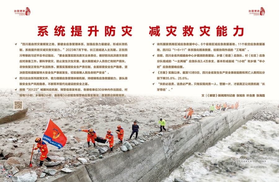◇“四川是自然灾害频发之地,要健全应急管理体系,加强应急力量建设,形成长效机制,系统提升防灾减灾救灾能力。”2023年7月下旬,长江流域进入主汛期。正在四川考察的习近平总书记指出,“要全面落实防汛救灾主体责任,做好防汛抗洪救灾各项应对准备工作。要科学救灾,防止发生次生灾害,最大限度减少人员伤亡和财产损失,尽快恢复正常生产生活秩序。要落实落细安全生产责任制,全面排查安全生产隐患,坚决防范和遏制重特大安全生产事故发生,切实保障人民生命财产安全”。 ◇四川出台系列政策文件,着力理顺应急管理体制机制,持续锤炼应急救援能力,源头消除安全生产风险隐患,不断筑牢现代化建设的安全之基。 ◇按照“30123”喊醒叫应机制,预警信息发布后,各接收单位30分钟内作出回应,村级每1小时、乡镇每2小时、县级每3小时报告预警响应落实情况,直至群众转移完毕。 ◇依托国家西南区域应急救援中心、6个省级区域应急救援基地、11个航空应急救援基地,四川以“1+6+11”体系强化精准救援,绘就协同作战的“工笔画”。 ◇目前,四川全省共组建由中心乡镇消防救援站、乡镇(街道)应急队、村(社区)应急分队组成的“一主两辅”应急队伍3.4万余支,基本形成县域“1小时”和乡镇“半小时”应急救援响应圈。 ◇《方案》实施以来,截至10月9日,四川全省发生生产安全事故起数和死亡人数同比分别下降35.8%、25.6%。 ◇“失职必追责、追责必严肃。只有实现问责一人、警醒一片,才能真正让问责机制‘长牙带齿’。” 统筹发展和安全,增强忧患意识,做到居安思危,是我们党治国理政的一个重大原则。 习近平总书记高度重视防灾减灾救灾和安全生产工作,多次就此发表重要讲话或作出重要指示。 在四川,“冬春防火、夏秋防汛、四季防地灾、全年防地震”是防灾减灾救灾工作突出特点,灾多、灾频、灾重、灾急是常态。加之安全生产仍处于爬坡过坎期,各类事故隐患和安全风险叠加。 “四川是自然灾害频发之地,要健全应急管理体系,加强应急力量建设,形成长效机制,系统提升防灾减灾救灾能力。”2023年7月下旬,长江流域进入主汛期。正在四川考察的习近平总书记指出,“要全面落实防汛救灾主体责任,做好防汛抗洪救灾各项应对准备工作。要科学救灾,防止发生次生灾害,最大限度减少人员伤亡和财产损失,尽快恢复正常生产生活秩序。要落实落细安全生产责任制,全面排查安全生产隐患,坚决防范和遏制重特大安全生产事故发生,切实保障人民生命财产安全”。 2023年以来,四川省获批55个自然灾害应急能力提升工程项目,47.8亿元国债资金专项用于工程建设;在成都市金堂县建成国家西南区域应急救援中心,整合各方应急救援力量,打造“航空尖兵”“空中先锋”提高救援效能……国家层面多项举措为四川系统提升防灾减灾救灾能力提供强有力支撑。 《关于构建应急管理职业共同体加快推进应急管理体系和能力现代化的意见》《四川省安全生产治本攻坚三年行动方案(2024—2026年)》……四川出台系列政策文件,着力理顺应急管理体制机制,持续锤炼应急救援能力,源头消除安全生产风险隐患,不断筑牢现代化建设的安全之基。 四川省委书记、省人大常委会主任王晓晖表示,四川将进一步压实责任,加强应急能力建设,全力以赴打好“防大汛、抢大险、救大灾”主动仗,坚决防范遏制群死群伤灾害事件发生,切实保障人民群众生命财产安全。 四川省眉山市应急管理局执法人员在一食品加工企业开展安全检查(2023年9月摄) 赵学兵摄 警钟始终长鸣 应急管理强化“一盘棋” 四川地形复杂,山区地质条件脆弱,主汛期山洪地灾交织、多类风险叠加,防汛减灾形势复杂严峻。补短板、堵漏洞,四川发挥“统”的优势、激发“专”的效能、发挥“聚”的合力,着力优化应急管理体制机制,加快推进应急管理体系和能力现代化。 今年汛期,在四川省防汛防地灾联合值班中心,来自水利、应急、自然资源等部门的联合值守人员每天密切关注降雨趋势,及时发布预警信息。为更好地实现防汛工作中的统一指挥、分工负责、整体推动,四川今年施行防救治一体化运行。 深度融合,统筹防救工作。防灾减灾救灾工作点多、线长、面广,应急系统内防灾减灾专业力量不足,而相关行业部门在精准预测和识别安全风险方面拥有较为成熟的机制、经验和队伍。形成“大应急”治理格局,需要各部门间高效协作。 今年6月,四川在原省应急委员会、减灾委员会基础上整合设立省防灾减灾救灾委员会,由省长担任委员会主任,下设防汛抗旱、森林草原防灭火、抗震救灾、地质灾害防治四个专项指挥部,健全日常灾害防范、应急响应处置、救灾救助等工作机制,更好统筹自然灾害防救工作。 发挥“统”的优势,不仅需打通横向部门,更强调纵向“一竿子插到底”。2023年发生的凉山州金阳县“8·21”山洪灾害事件,暴露出预警信息发布后的“叫而不响”“响而不应”短板。吸取灾害教训,四川将2024年山洪灾害防御总体策略调整为“风险评价+分级管理+分类响应”。 四川省防汛抗旱指挥部介绍,按照“30123”喊醒叫应机制,预警信息发布后,各接收单位30分钟内作出回应,村级每1小时、乡镇每2小时、县级每3小时报告预警响应落实情况,直至群众转移完毕。同时,按照信息发布、接收回应、