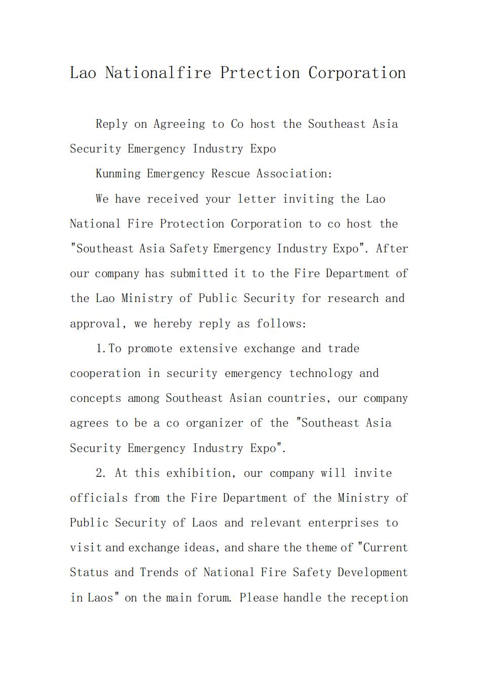 为促进东南亚各国在安全应急技术及理念的广泛交流与贸易合作,经昆明市应急救援协会邀请,近日收到老挝国家消防总公司关于同意作为“东南亚安全应急产业博览会”联合主办单位的复函。届时老挝国家消防总公司将邀请老挝公安部消防局官员及有关的企业到场参观交流,并在主论坛上做“老挝国家消防安全发展现状及趋势”主题分享。